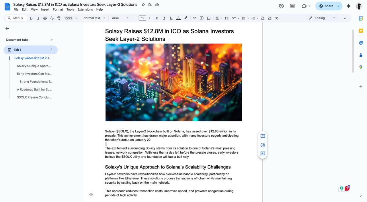 Solaxy presents itself as a Layer-2 solution designed to improve scalability on the Solana network through off-chain processing and transaction bundling.